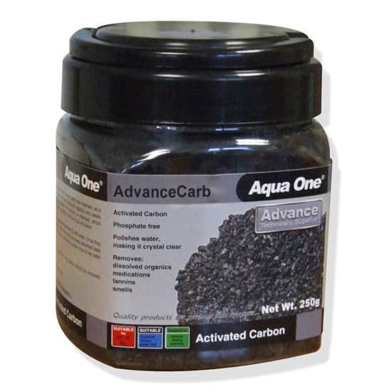 A 450g pack of Aqua One Advance Carb, Excellent Quality phosphate-free, high adsorption activated carbon for any filtration application requiring quality and efficiency. Great in any canister filter, the carbon comes in a good quality tub with a screw on lid to keep it dry and a free net media bag is provided to make the Advance carbon easy to handle and change.